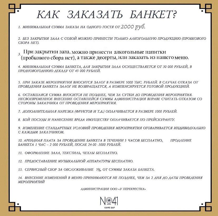 5 января 2024г. в Кафе №41 отмечали юбилей супруга. Всё очень понравилось, а именно: очень вкусные блюда, красивая сервировка, уютное помещение с интерьером в стиле лофт, корректное обслуживание, прекрасное музыкальное сопровождение с живой музыкой ! Юбилей удался, все гости были очень довольны!!! Огромная благодарность администратору Марине, которая всегда была готова помочь, тамаде Марине, которая создала веселую атмосферу праздника и великолепно играла на саксофоне , а также благодарим шеф-повара и весь обслуживающий персонал. Дальнейших успехов коллективу Кафе №41!)))