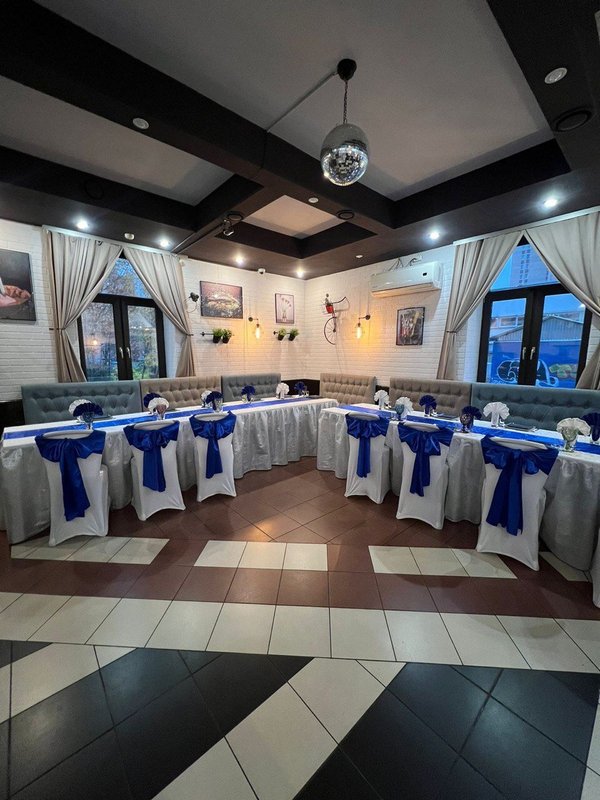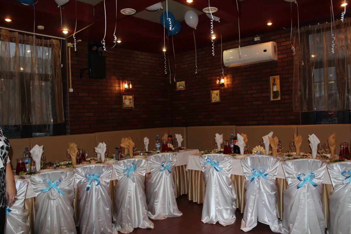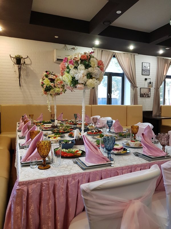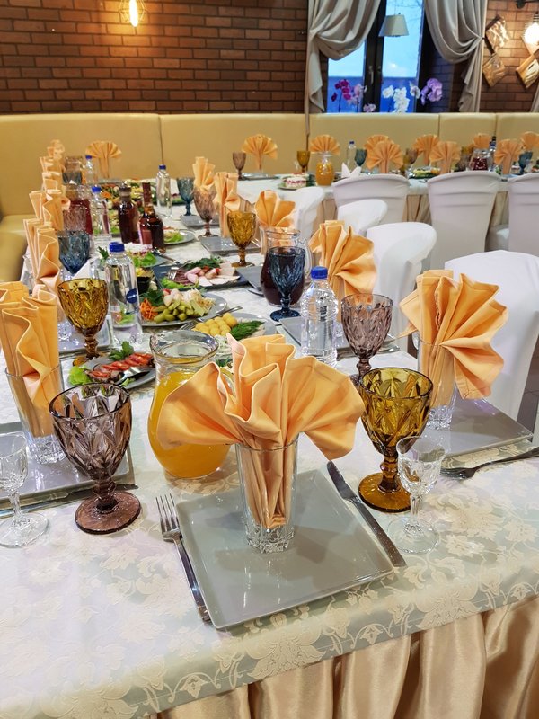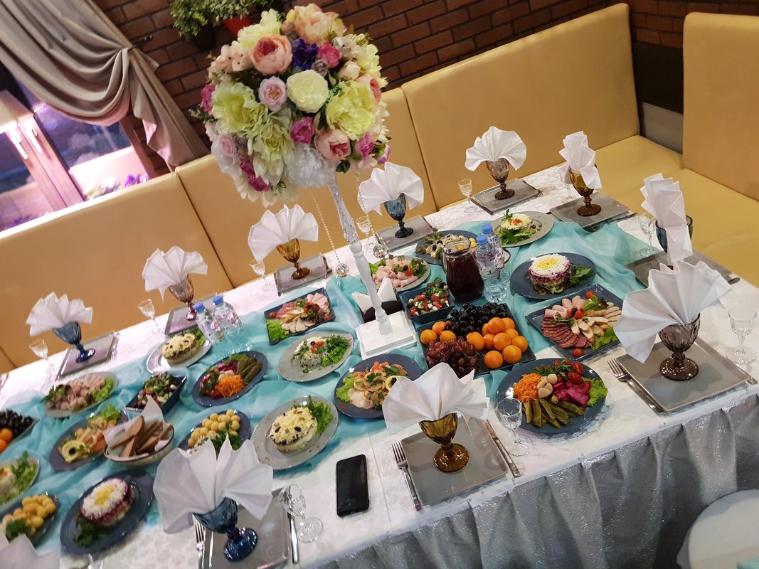 Выбрали кафе для проведения юбилея. Устроило все: сервировка, обслуживание, кухня. Меню заказывали предварительно. Основные блюда - это рыба, мясной салат, шашлыки. Гостей было 16 человек, но все остались довольны. Напитки мы привозили свои. Достаточно красиво было оформлено основное блюдо, салфетки, которые лежат в бокалах, на это гости обратили внимание. Оформление скатерти, чехлы. Было красиво, нарядно. Официанты все вовремя приносили и забирали, все делали правильно, без задержек. Успевали все забирать, чтобы ничего лишнего не стояло.