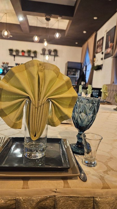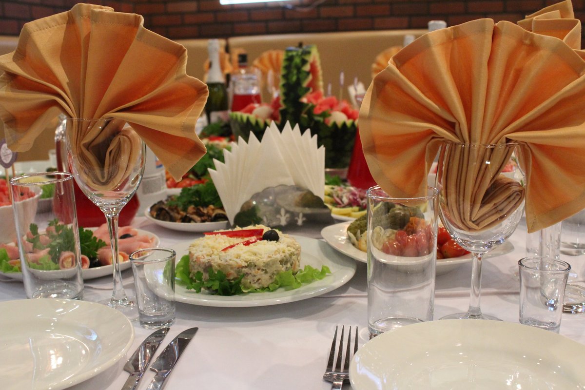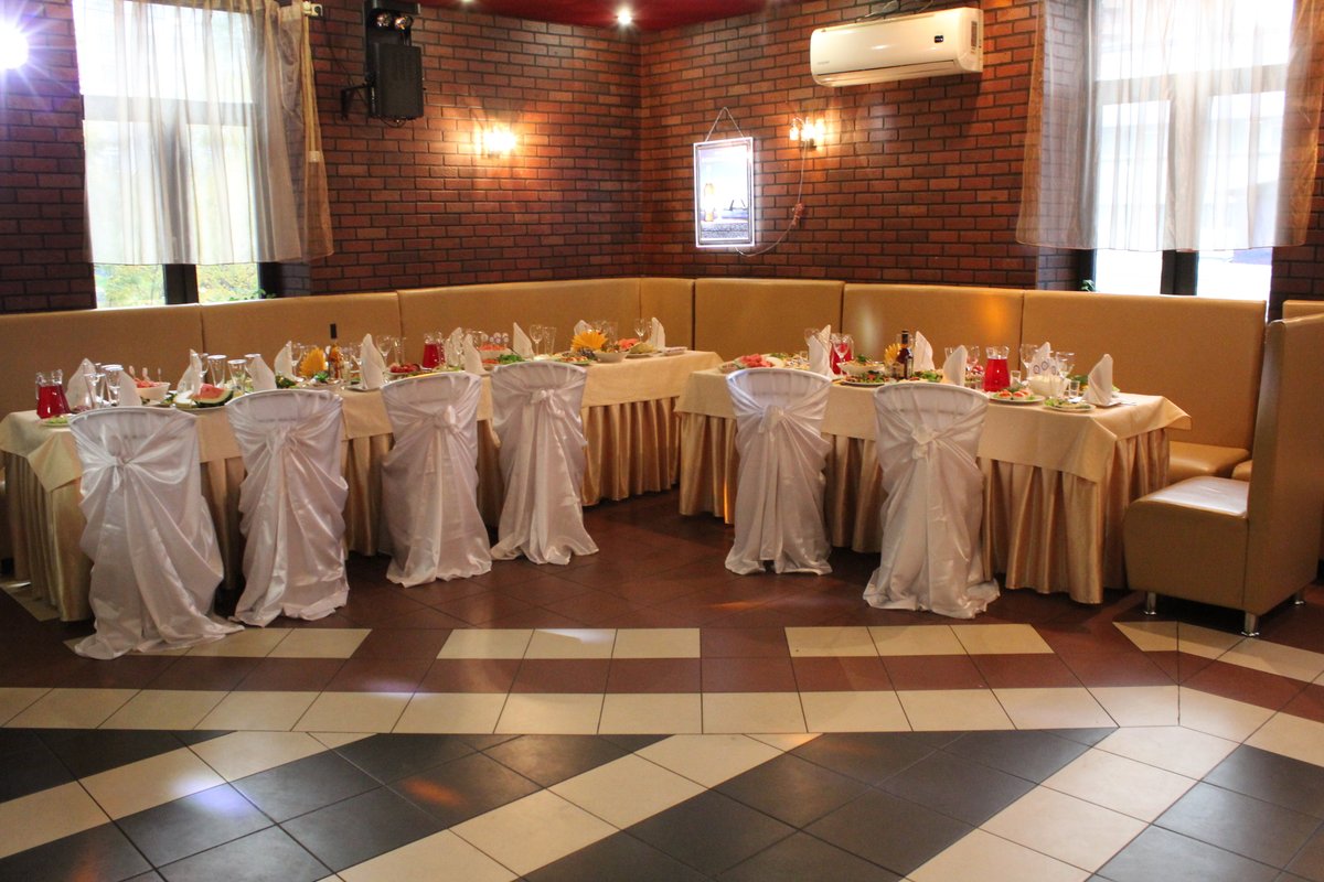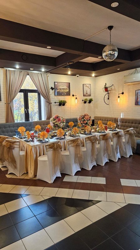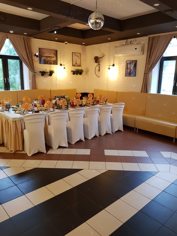 Выбрали кафе для проведения юбилея. Устроило все: сервировка, обслуживание, кухня. Меню заказывали предварительно. Основные блюда - это рыба, мясной салат, шашлыки. Гостей было 16 человек, но все остались довольны. Напитки мы привозили свои. Достаточно красиво было оформлено основное блюдо, салфетки, которые лежат в бокалах, на это гости обратили внимание. Оформление скатерти, чехлы. Было красиво, нарядно. Официанты все вовремя приносили и забирали, все делали правильно, без задержек. Успевали все забирать, чтобы ничего лишнего не стояло.